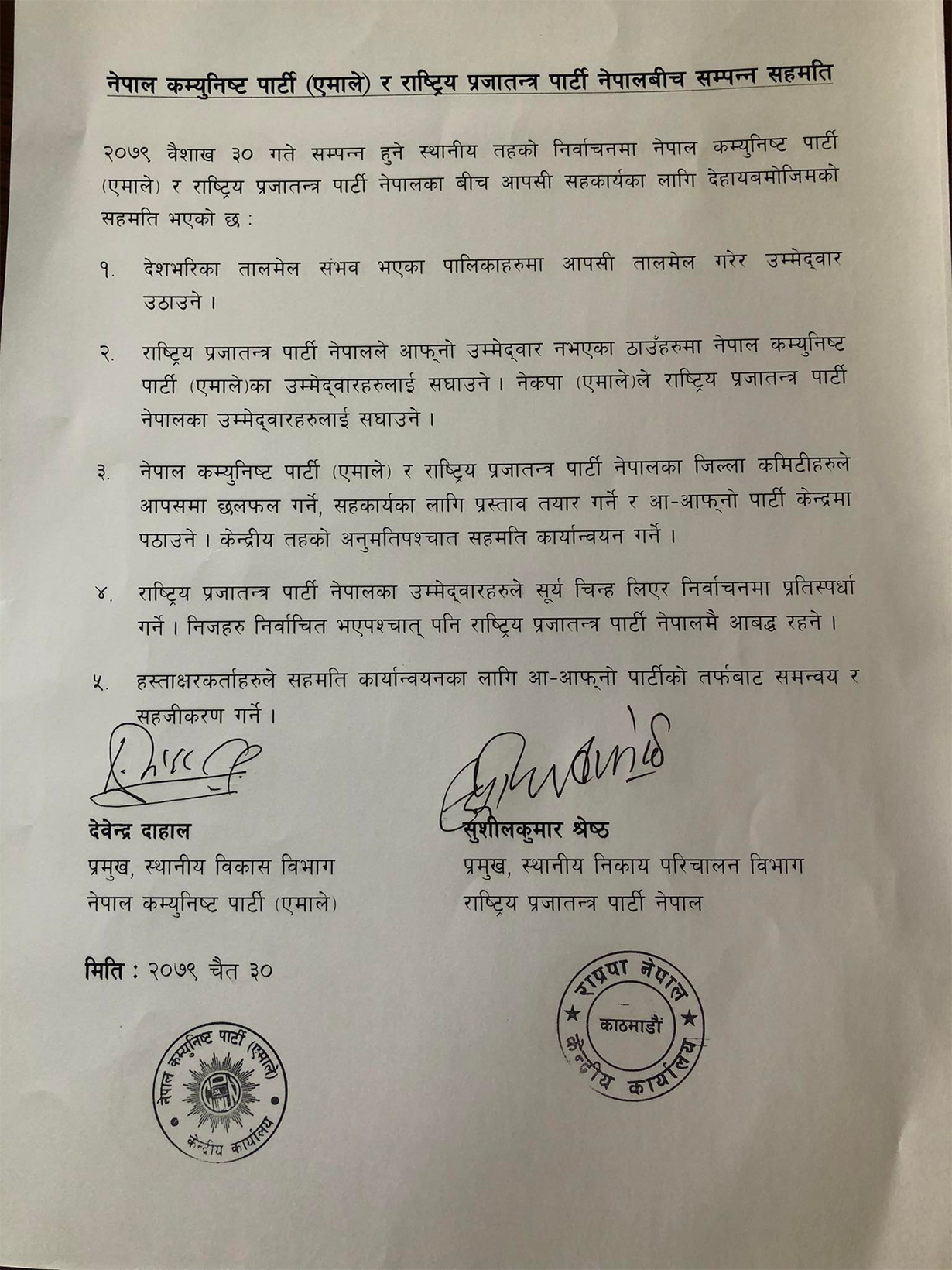 एमालेका स्थानीय विकास विभाग प्रमुख देवेन्द्र दाहाल र राप्रपा नेपालका स्थानीय निकाय परिचालन विभागका प्रमुख सुशीलकुमार श्रेष्ठले ५ बुँदे सहमतिमा हस्ताक्षर गरेका छन् ।