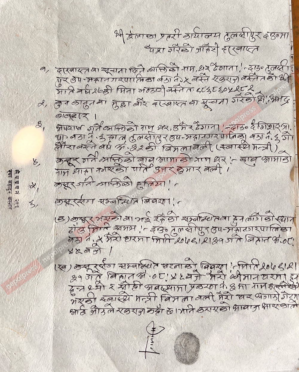 ईप्रका तुलसीपुरका निमित्त प्रमुख प्रहरी निरीक्षक रञ्जन स्वाँरले स्वास्थ्य राज्यमन्त्रीबिरुद्ध किटानी जाहेरी आएको पुष्टि गरे ।