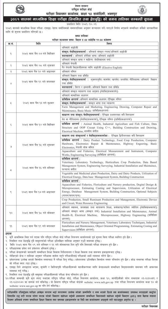 दोस्रो दिन चैत ८ गते अनिवार्य नेपाली विषयको परीक्षा हुने छ । चैत १० गते अनिवार्य गणित र चैत १२ गते अनिवार्य विज्ञान विषयको परीक्षा हुने परीक्षा नियन्त्रण कार्यालयको तालिकामा उल्लेख छ ।