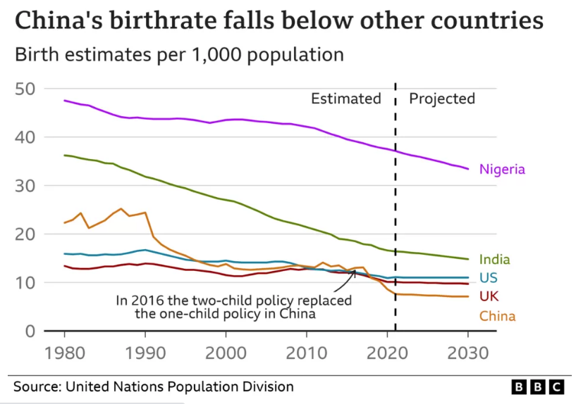 जनसङ्ख्या घट्दै गएपछि चीन सरकारले सात वर्ष अघि एक सन्तान नीति खारेज गरेको थियो । तर एक सन्तान नीति खारेज गरेको सात वर्षपछि जनसङ्ख्या नकरात्मकतर्फ गएको छ । यस्तै सन् २०२२ मा मृत्युदर पनि अहिलेसम्मकै धेरै भएको छ । यसअघि सन् १९७६ मा सबैभन्दा धेरै सात दशमलव ३१ प्रति एक हजार मानिसको मृत्यु भएकोमा गएको वर्ष प्रति एक हजार जनामा सात दशमलव ३७ जनाको मृत्यु भएको छ ।