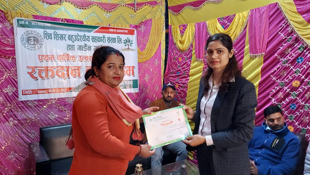 हेटौंडा । हेटौंडा उपमहानगरपालिका वडा नम्बर–४ मा रहेको शिव शिखर बहुउद्देशयीय सहकारी संस्था लिमीटेड सदस्य सेवा केन्द्र तथा गार्डेन मार्ट हेटौंडाको पहिलो वार्षिकोत्सवका अबसरमा रक्तदान कार्यक्रम गरिएको छ । कार्यक्रममा ५० जनाले रक्तादान गर्नुभयो । रक्तदान जीवन दान भन्ने मूल नाराका साथ कार्यक्रम गरिएको हो ।