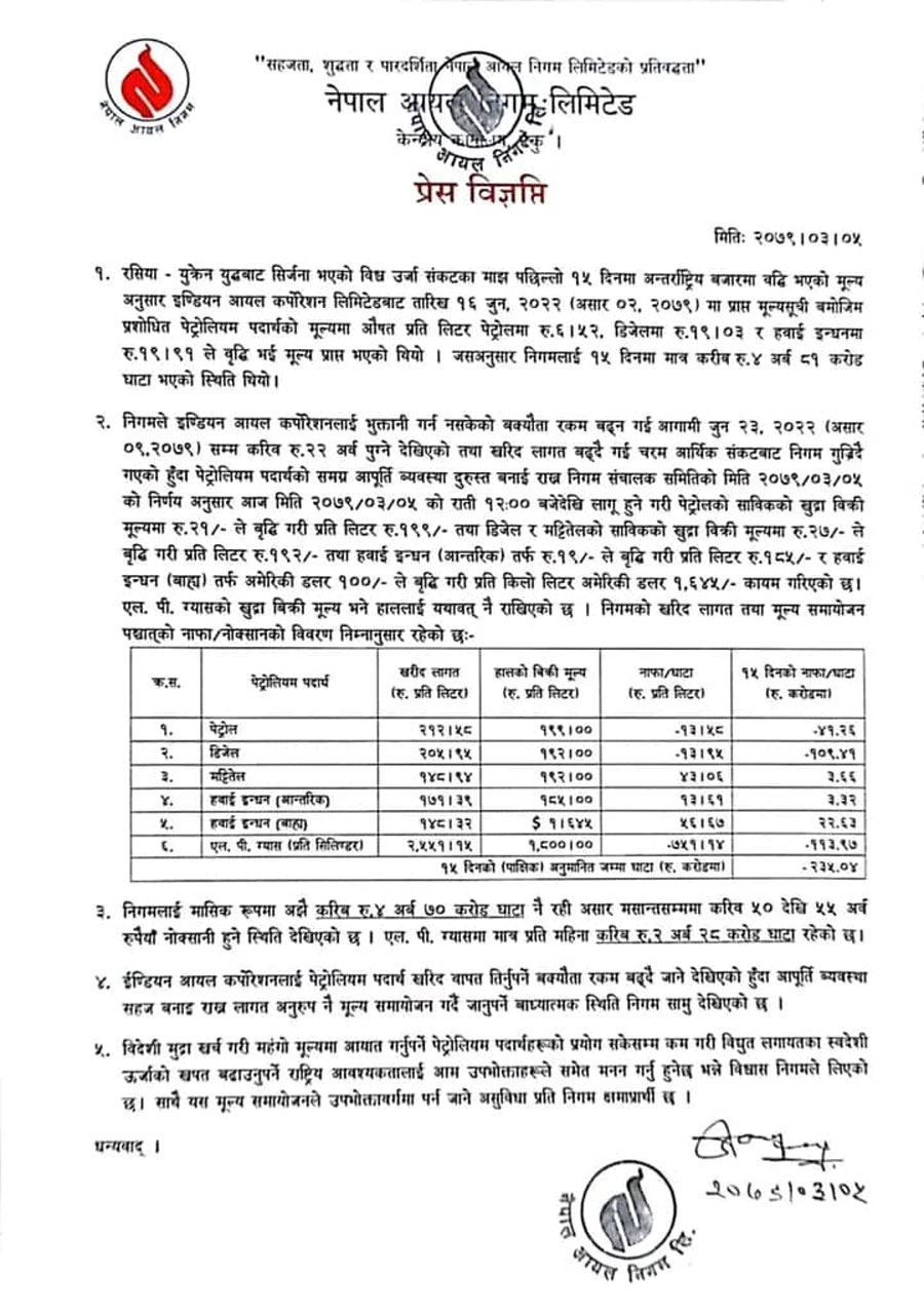 निगम सञ्चालक समितिको बैठकले डिजेल तथा मट्टीतेलमा प्रतिलिटर २७ रुपैयाँले र पेट्रोलमा प्रतिलिटर २१ रुपैयाँले मूल्य वृद्धि गरेको हो । बढेको मूल्य आज राति १२ बजेदेखि लागु हुने निगमले जनाएको छ ।