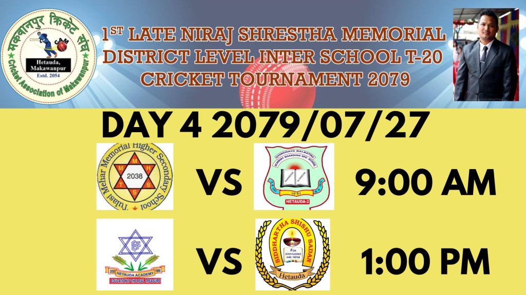 हेटौंडा । हेटौंडा ४ हुप्रचौरमा जारी निरज श्रेष्ठ स्मृति जिल्लास्तरीय अन्तरविद्यालय क्रिकेट प्रतियोगितामा आइतबार भएको पहिलो खेलमा तुलसीमेहर मेमोरियल स्कूल विजयी भएको छ । तुल्सीमेहरले ज्ञानोदय बालबाटिकालाई ६ विकेटले पराजित गरेको हो ।