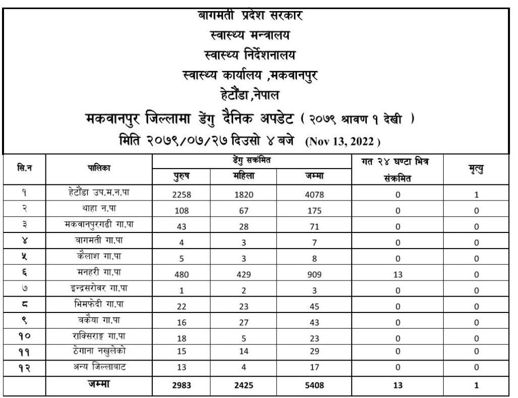 गत साउनदेखि हाल सम्म मकवानपुरमा डेंगु संक्रमितको संख्या ५ हजार ४०८ पुगेको छ । जिल्लामा डेंगु संक्रमणका कारण एक जनाको मृत्यु भएको थियो ।