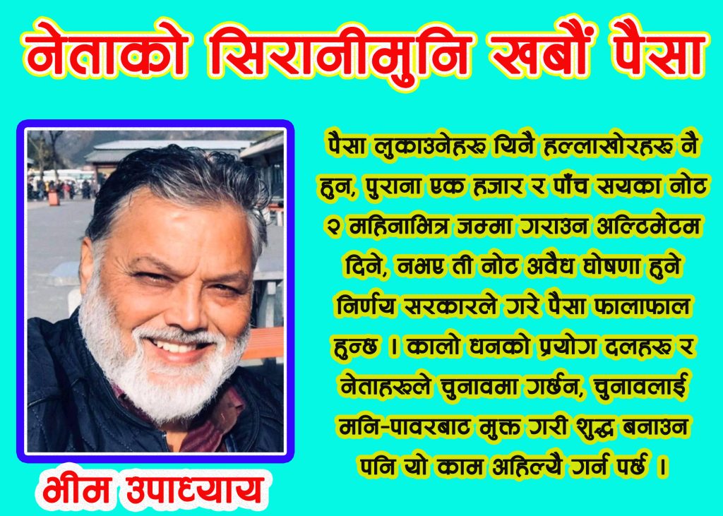 हेटौंडा । पूर्वसचिव भीम उपाध्यायले अहिले बजारमा पैसा नभएको र नेताहरुको सिरानीमुनी खबौं पैसा लुकाएको टिप्पणी गरेका छन । उनले सामाजिक सञ्जालमा बजारमा पैसा छैन, सिरानीमुनि खर्बौँ लुकाएका छन् भनेर टिप्पणी गरेका हुन ।