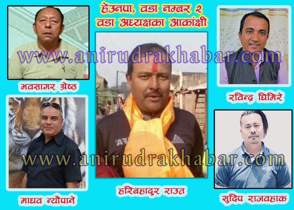 आसन्न स्थानीय निकायको निर्वाचनमा हेटौंडा उपमहानगरपालिका वडा नम्बर २ को वडा अध्यक्षमा दावि र आकांक्षीहरुको लामै लिष्ट तयार भएको छ । यो समाचार तयार पार्दा सम्म नेकपा एमाले, नेपाली काग्रेस र राप्रपा नेपालको वडा अध्यक्ष आंकाक्षी तथा दावेदारीमा ६ जना देखिएका छन ।