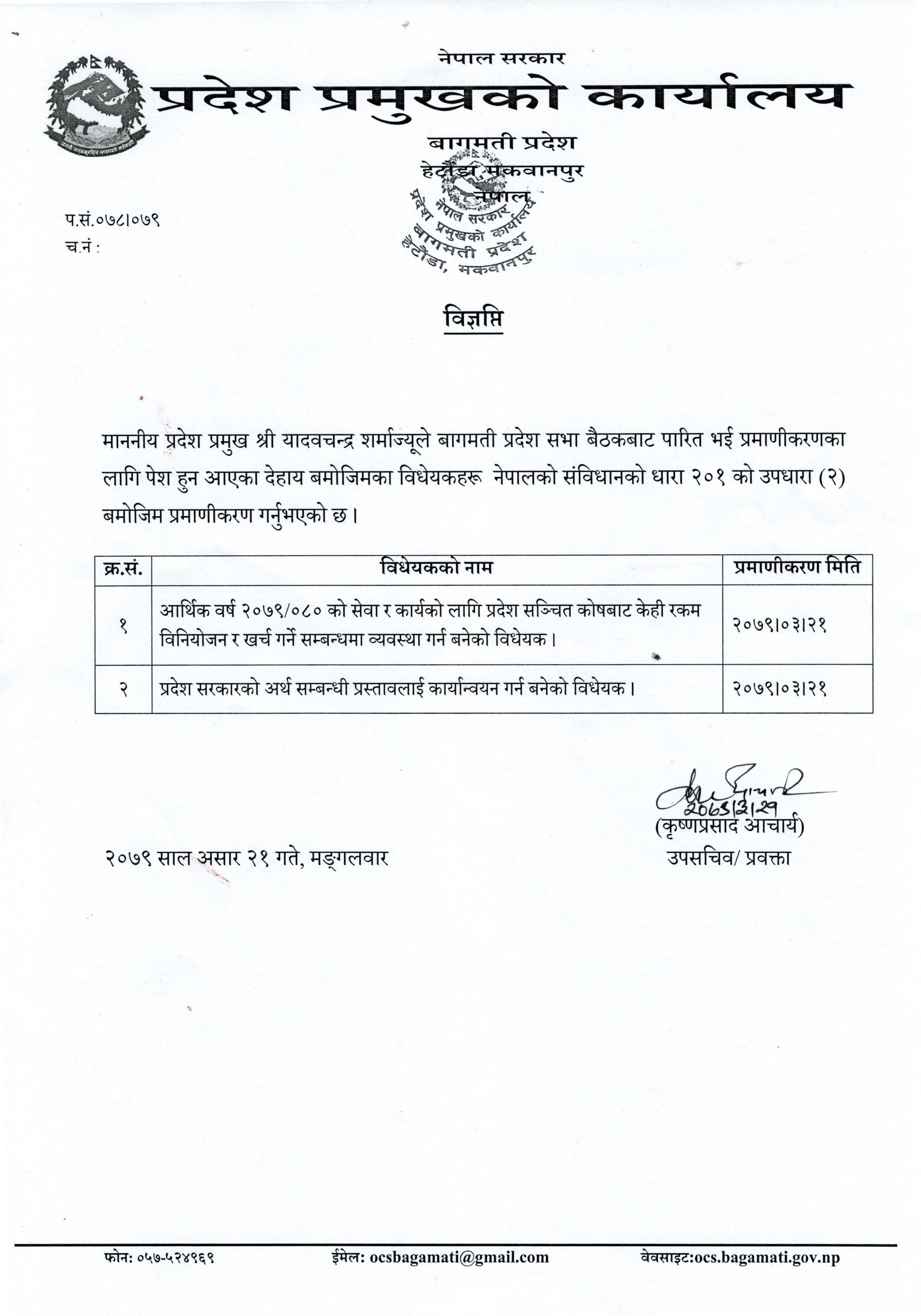 नेपालको संविधानको धारा २०१ को उपाधारा (१) बमोजिम प्रदेश प्रमुख शर्माले ‘‘आर्थिक वर्ष २०७९/०८० को सेवा र कार्यका लागि प्रदेश सञ्चित कोषबाट केही रकम विनियोजन र खर्च गर्ने सम्बन्धमा व्यवस्था गर्न बनेको विधेयक’’ र ‘‘प्रदेश सरकारको अर्थ सम्बन्धी प्रस्तावलाई कार्यान्वयन गर्न बनेको विधेयक’’ प्रमाणिकरण गरेका हुन ।