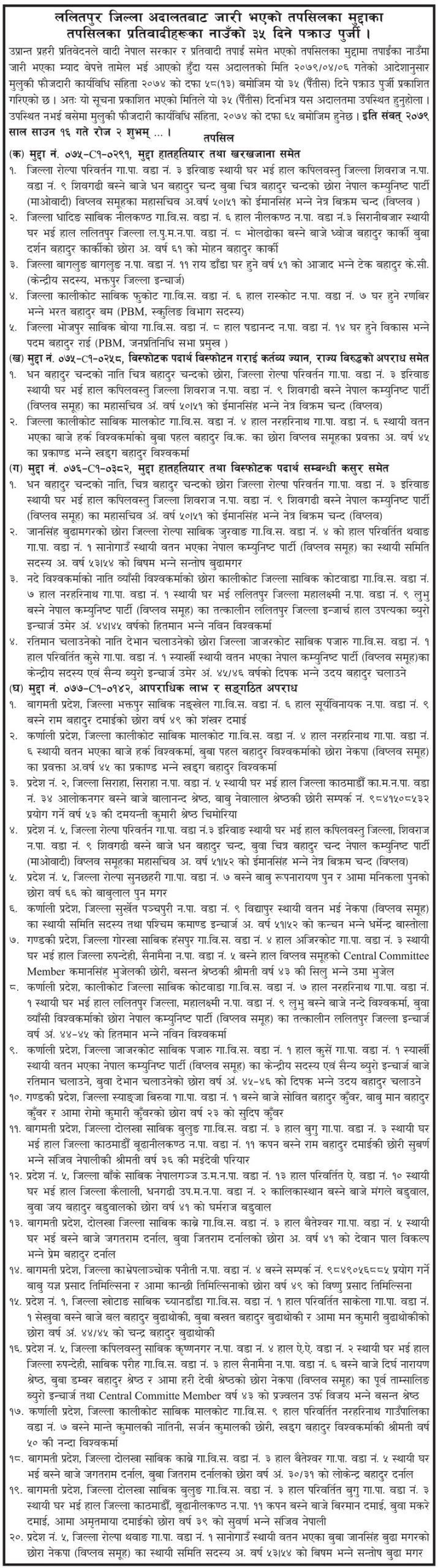 अदालतले सूचना निकालेर हातहतियार तथा खरखजाना समेतको मुद्दा, विस्फोटक पदार्थ विस्फोटन गराइ कर्तव्य ज्यान, राज्य विरुद्धको अपराध समेतको मुद्दा, हातहतियार तथा विस्फोटक पदार्थ सम्बन्धी कसुरको मुद्दा लागेको भन्दै पक्राउ पुर्जी जारी गरेको हो ।