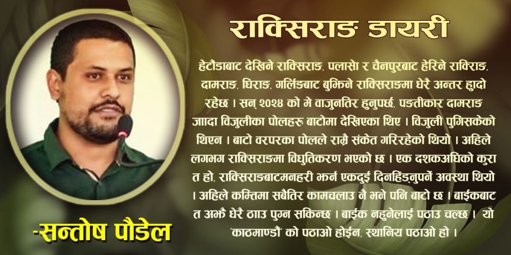 हेटौंडाबाट देखिने राक्सिराङ, पलासेँ र चैनपुरबाट हेरिने राक्रिाङ, दामराङ, धिराङ, गर्लिङबाट बुझिने राक्सिराङमा धेरै अन्तर हुँदो रहेछ । सन् २०२४ को मे वाजुनतिर हुनुपर्छ, पङतीकार दामराङ जाँदा विजुलीका पोलहरु बाटोमा देखिएका थिए । विजुली पुगिसकेको थिएन । बाटो वरपरका पोलले राम्रै संकेत गरिरहेको थियो । अहिले लगभग राक्सिराङमा विधुतिकरण भएको छ । एक दशकअघिको कुरा त हो, राक्सिराङबाटमनहरी झर्न एकदुई दिनहिंड्नुपर्ने अवस्था थियो । अहिले कम्तिमा सबैतिर कामचलाउ नै भने पनि बाटो छ । बाईकबाट त अझै धेरै ठाँउ पुग्न सकिन्छ । बाईक नहुनेलाई पठाउ चल्छ । यो “काठमाण्डौं” को पठाओ होईन, स्थानिय पठाओ हो । बाईक हुने युवाहरु केहि पैसा लिएर यात्रुलाई गन्तब्य पु¥याईदिन्छन् । फ्युचर जेनेरेशन नेपालको आउटरिच वर्कर सुबिना भुजेल प्रायपठाओ बाटै ओहोरदोहोर गर्नुहुन्छ । गाडिको विकल्पछिटो, छरितो पठाओ १“पठाओ”ब्रान्ड नेम प्रतिको आकर्षण, यो पनि विश्व ब्यापिकरण कै प्रभावहो कि !