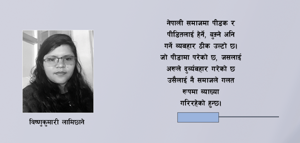 नेपाली समाजमा पीडक र पीडितलाई हेर्ने, बुझ्ने अनि गर्ने व्यवहार ठीक उल्टो छ। जो पीडामा परेको छ, जसलाई अरूले दुव्र्यवहार गरेको छ उसैलाई नै समाजले गलत रूपमा व्याख्या गरिरहेको हुन्छ। पीडकलाई केही समय थुनामा राख्नुपर्ने अवस्थामा पनि पूरै समाज उल्टिएर नाराबाजी गर्न पुग्दछन् अनि थुनामुक्त हुँदा निजले ठूलो आविष्कार र उपलब्धि गरेझैँ फूलमाला र अबिरले सम्मान गरेर बाजागाजा बजाउँछन्।