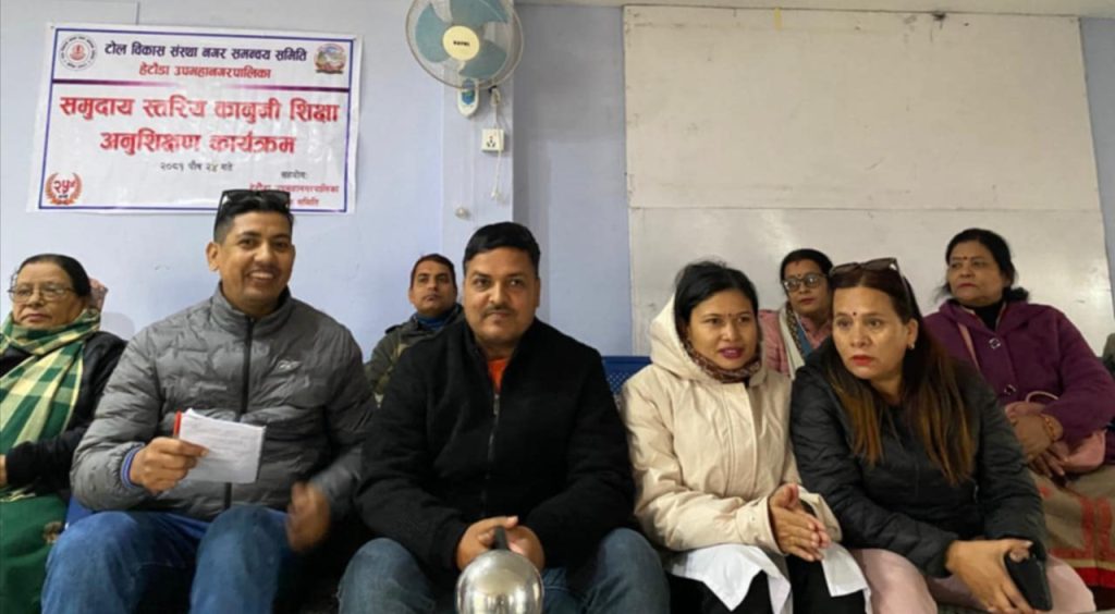 हेटौंडा । टोल विकास संस्था नगर समन्वय समिती, हेटौंडा उपमहानगरपालिकाले हेटौंडा-९ नं वडामा गठित टोल विकास संस्था एवम् अन्य संघ संस्थाका पदाधिकारी एवं सदस्यहरूको लागि १ दिने समुदाय स्तरिय कानुनी शिक्षा अनुशिक्षण कार्यक्रमको आयोजना गरेको छ ।