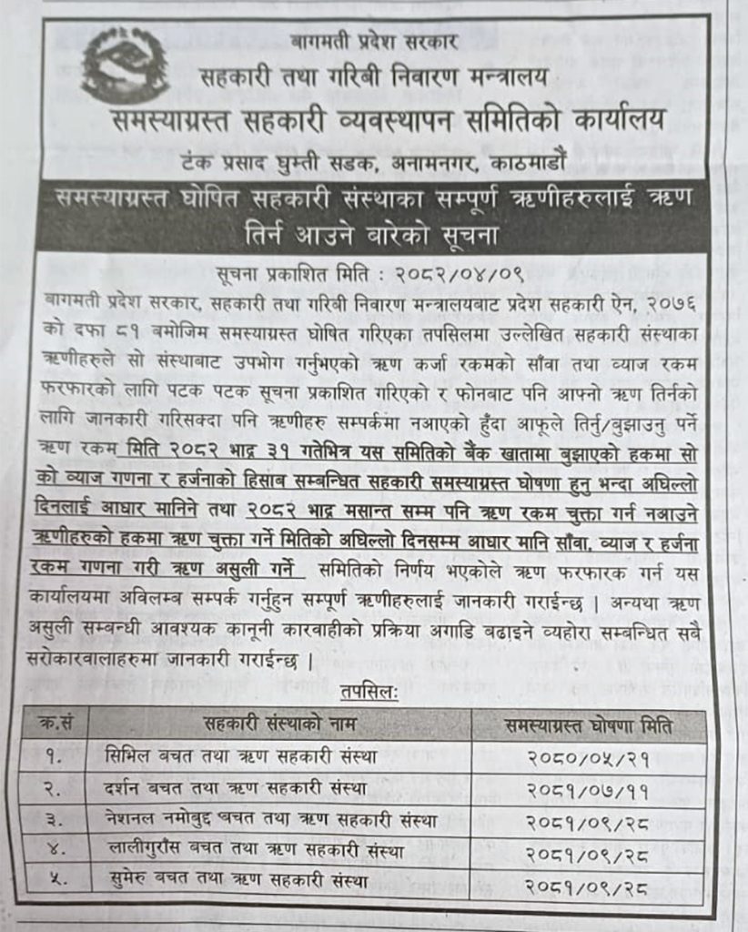 बागमती सरकारको सहकारी तथा गरिबी निवारण मन्त्रालयअन्तर्गत समस्याग्रस्त सहकारी व्यवस्थापन समितिको कार्यालयले शुक्रबार सूचना जारी गरेको हो ।प्रदेश सहकारी ऐन, २०७६ को दफा ८१ बमोजिम समस्याग्रस्त घोषित सिभिल बचत तथा ऋण सहकारी संस्था, दर्शन बचत तथा ऋण सहकारी संस्था, नेसनल नमोबुद्ध बचत तथा ऋण सहकारी संस्था, लालीगुराँस बचत तथा ऋण सहकारी संस्था र सुमेरु बचत तथा ऋण सहकारी संस्थाका ऋणीलाई कर्जा रकमको साँवा तथा ब्याज भदौ ३१ भित्र उक्त समितिको बैंक खातामा बुझाउन भनिएको छ ।