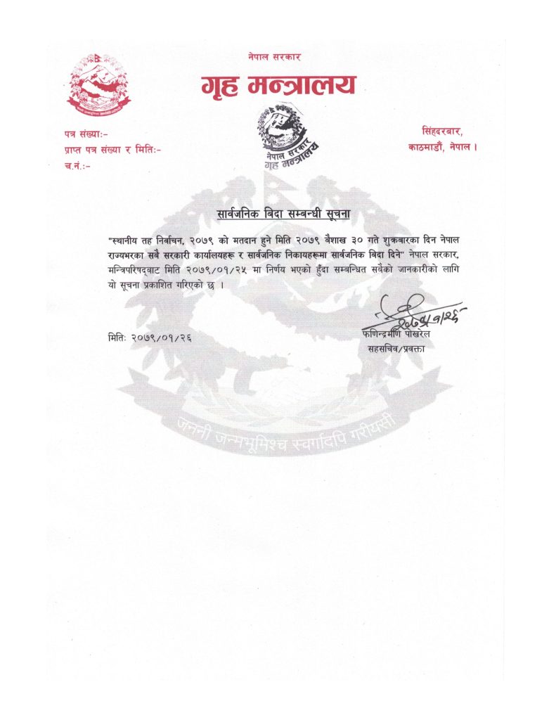 काठमाण्डौ । यही वैशाख ३० गते हुने पालिका चुनावको दिन सरकारले सार्वजनिक बिदा दिएको छ ।