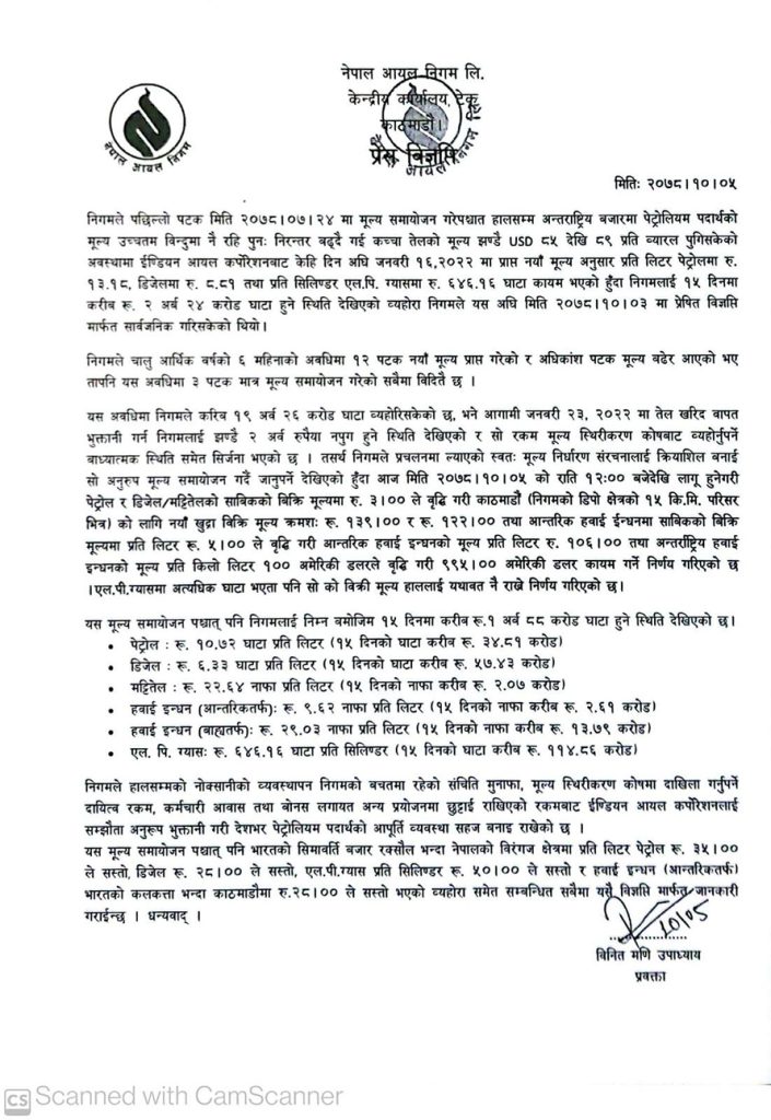 निगमले चालु आर्थिक वर्षको ६ महिनाको अवधिमा १२ पटक नयाँ मूल्य प्राप्त गरेको र अधिकांश पटक मूल्य बढेर आएको भएपनि ३ पटक मात्र मूल्य समायोजन गरेको निगमले जानकारी दिएको छ ।